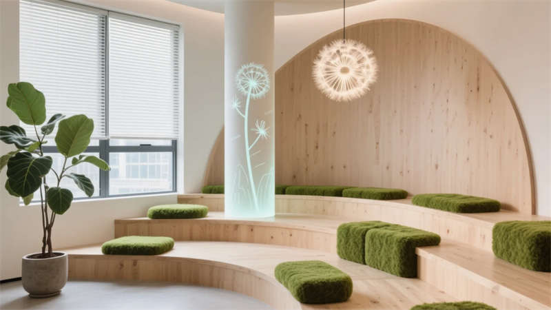 智能會議艙化身科技繭房,霧化玻璃平衡開放與隱私,觸控桌面簡化流程。貫穿始終的暖木、灰白與苔蘚綠,在全景天光下沉淀出寧靜能量。此處不僅是工作容器,更是蚌埠創新浪潮下,滋養靈感、尊重個體的未來生態聚落。