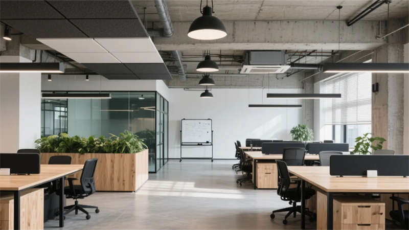 步入大堂,粗獷的混凝土墻面與水磨石地面形成質感對話,懸浮金屬網天花下,原木前臺與背光綠植墻暈染出溫潤生命力。開放式辦公區延續工業基調,模塊化橡木桌搭配黑色鋼架,綠植隔斷巧妙劃分空間,自然光穿過智能遮陽簾,在混凝土天花上投下流動的光影詩行。
