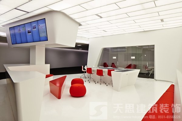綜合大樓過渡區設計為開放式合作工作區域,傳統的理念通常認為這里和工作場所相比不是那么有用,但是很多富有成效的非正式的討論往往在這里誕生。每個工作中心都配有色彩鮮明的家具,頂部下方挑檐底面突出的吊頂造型內嵌LED顯示屏,不斷滾動播出最新信息,包括各種通知、員工和訪客新聞、各種公告、新聞事件以及全球3M公司員工信息。