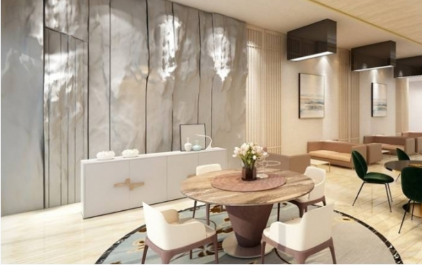 淺灰色的運用集中在待客區的沙發色和吊燈以及墻壁上點綴的元素,同一色系的運用分散在整個空間中,既不在局部上造成較大的色塊沖擊,表現溫和;又能夠在整體上體現呼應的設計原則。