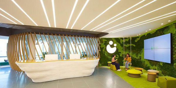木制材質頂板加上錯綜非規(guī)則紋路的前臺造型,再搭配綠色樹林墻身、秋千以及俏皮創(chuàng)意的蘑菇凳,讓前臺充滿了既視感。這不再是一個單純的辦公室,而是一個可以自由舒適徜徉其中的樂園。