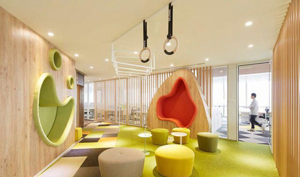 在樹屋的另一側設計著吊杠和造型樹洞,以及擺放活潑多樣的休閑家私,增添了工作或者閑暇溝通中的樂趣和互動性更讓員工在輕松辦公的同時有拉伸小鍛煉的機會