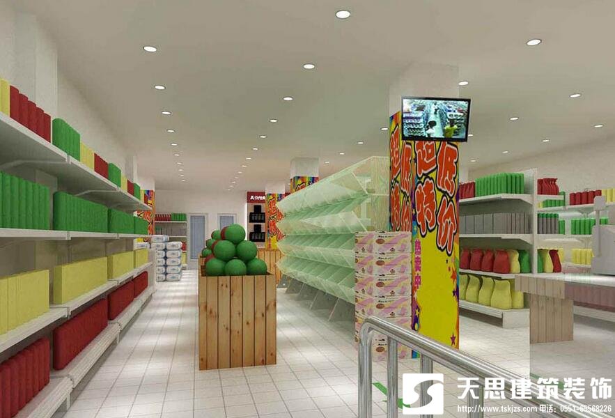 便利店對店鋪層高的要求一般在3米以上,但由于所選擇的店面多數(shù)處于底層,天花板下多數(shù)有下水管、電線管、消防管等管道,這時不要安裝吊頂天棚將這些管道隔離,只要這些管道粉刷成純白色,并將光源置于管道之下即可,這樣既可以保證商店的空間,又可以節(jié)省費用。