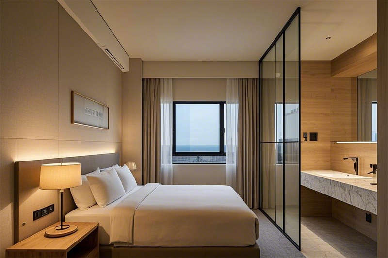 客房設(shè)計延續(xù)了現(xiàn)代簡約的風(fēng)格,淺木色與灰色的主色調(diào)搭配,營造出寧靜而舒適的居住環(huán)境。寬敞的落地窗將城市美景盡收眼底,智能燈光系統(tǒng)與電動窗簾為您提供便捷的入住體驗(yàn)。干濕分離的衛(wèi)生間采用大理石臺面與玻璃隔斷,既實(shí)用又彰顯品質(zhì),讓您在繁忙的旅途中也能享受片刻的放松。
