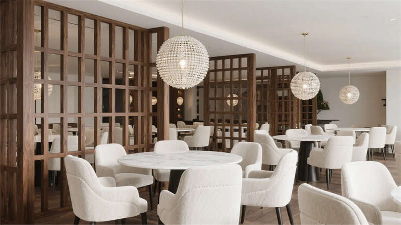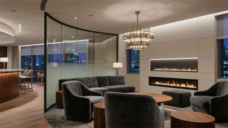 公共空間注重功能與美學的平衡。行政酒廊通過弧形玻璃劃分動靜區域,嵌入式壁爐跳動的火焰軟化商務空間的冷峻感;多功能會議室采用可變形家具系統,胡桃木飾面墻與線性燈光共同構建專注場域;全日餐廳以開放式廚房為舞臺,球形吊燈在巖板餐桌上投下溫暖光暈,激發商務社交的愉悅可能。