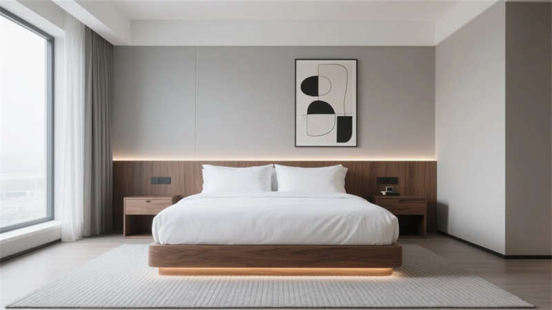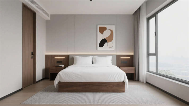 這個商務酒店的設計以現代簡約美學重構城市商旅空間。設計摒棄繁復裝飾,運用暖灰與胡桃木的主色調營造溫潤氛圍,香檳金金屬細節勾勒精致輪廓,在理性秩序中注入藝術溫度。