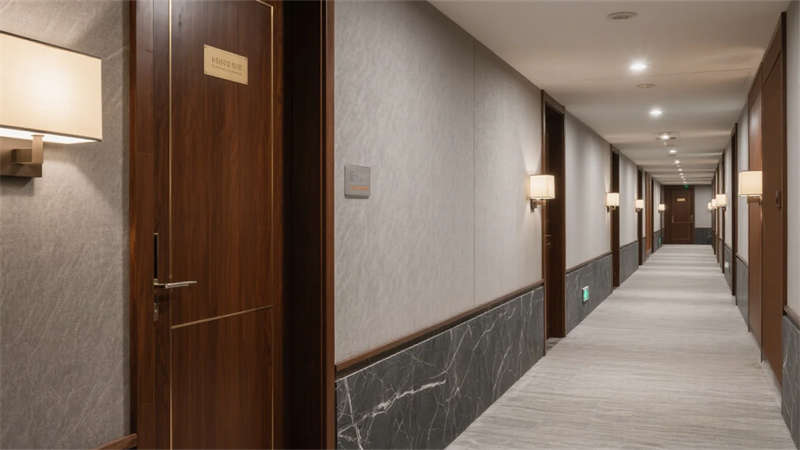 健康關懷滲透于細節設計中。健身房落地窗最大化引入自然景觀,橡膠地面與鏡面墻體形成虛實對話;電梯廳香檳金轎廂與石材墻面碰撞出質感層次,每處轉角皆設置藝術端景,讓行進過程成為美學巡禮。走廊絨面墻體的細膩觸感消解了通道的單調性,精心計算的燈光角度引導賓客自然抵達目的地。