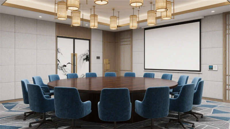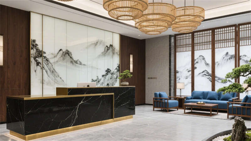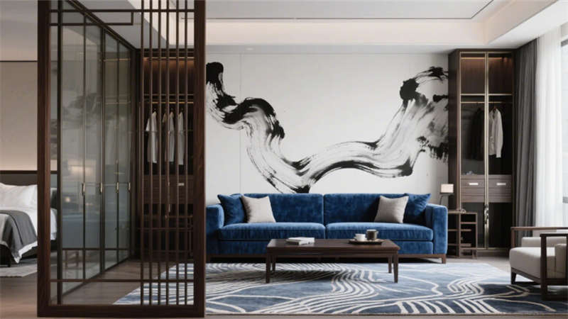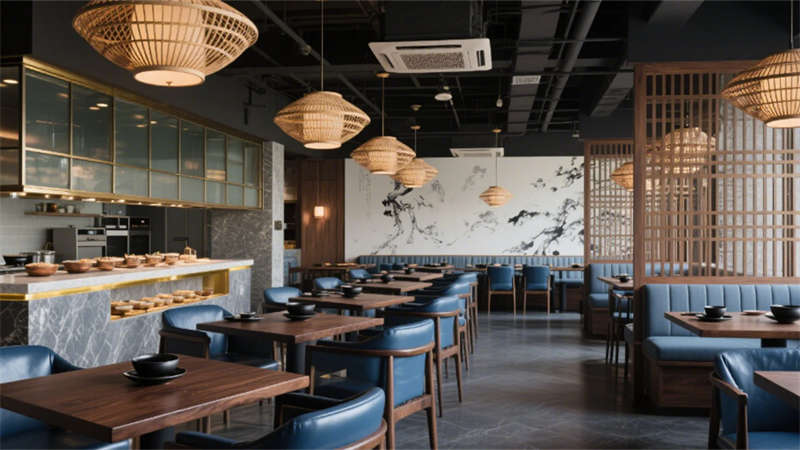 步入大堂,深胡桃木墻面與淺灰石材地面構(gòu)成經(jīng)典東方底色,水墨藝術(shù)玻璃屏風(fēng)似山巒疊嶂,懸浮竹編吊燈以編織肌理軟化空間。靛藍(lán)色沙發(fā)與黃銅細(xì)節(jié)的點(diǎn)綴,既延續(xù)外立面色彩邏輯,又激活視覺(jué)層次。餐飲空間延續(xù)木格柵語(yǔ)言,竹編燈罩與黑陶器皿在開(kāi)放式廚房的金屬框架中碰撞,演繹“新舊共生”的餐飲儀式。