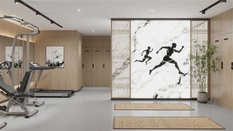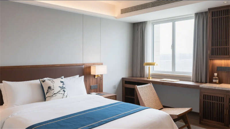 客房區(qū)域以“去符號(hào)化”手法詮釋東方美學(xué):深木紋床頭背板嵌入隱晦的水墨紋樣,藤編躺椅與迷你吧木格柵柜體,在3000K暖光中營(yíng)造居停的松弛感。套房通過(guò)絲絨沙發(fā)與抽象水墨畫(huà)提升奢華調(diào)性,浴缸區(qū)的竹藝卷簾巧妙平衡通透與私密。公共空間亦貫徹統(tǒng)一語(yǔ)匯——健身房竹編地墊與水墨運(yùn)動(dòng)壁畫(huà)、走廊絹絲燈箱與枯山水景墻,皆以現(xiàn)代材質(zhì)轉(zhuǎn)譯傳統(tǒng)元素。