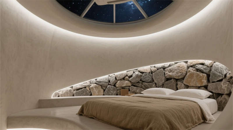 功能布局巧妙銜接室內外呼吸感:接待廳玻璃幕墻引竹林入畫,禪茶室借枯山水凝神靜氣;餐廳與書吧以可移動家具實現場景轉換,暗藏式光源在夜間描摹空間輪廓??头吭O計強調私密療愈,星空穹頂與混凝土浴缸形成原始與現代的詩意碰撞。