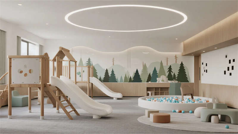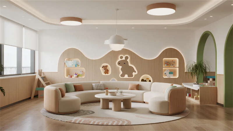 這座親子民宿以現代簡約美學為靈魂,將自然元素與童趣設計無縫銜接。空間摒棄繁復裝飾,選用淺木、純白與低飽和色彩鋪陳,弧形線條與柔和光影交織,營造出寧靜而溫暖的氛圍。從大堂的嵌入式動物燈箱到套房的樹屋床鋪,每一處細節都暗藏親子互動巧思,安全圓角家具與軟包地臺呵護孩童探索的每一步。