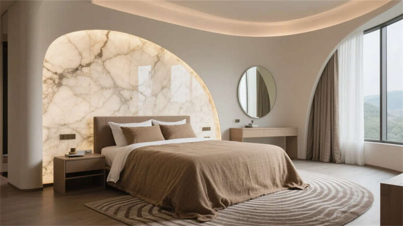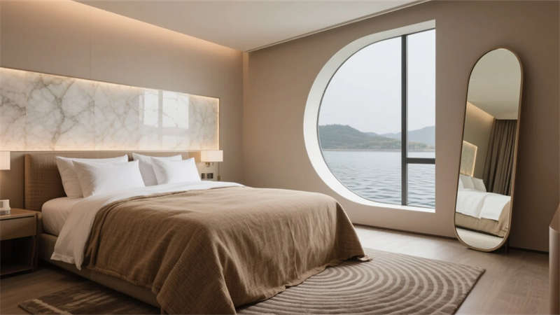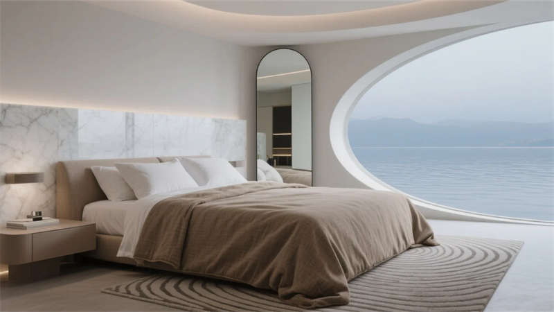 每一處細節皆成藝術現場——走廊夯土墻鐫刻時光肌理,發光地磚指引探索路徑;臥室弧形鏡面折射虛實,讓人沉入湖居夢境。這里不僅是棲居之所,更是一場喚醒感官的在地美學巡禮,讓合肥的湖韻林語,成為流淌于日常的奢享印記。
