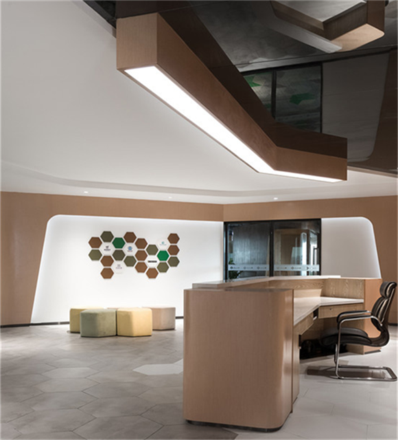 通過空間調(diào)度,模糊各個工作區(qū)域間的界限,打造既開放、又不乏私密性的辦公區(qū)。除此之外,曲線與直線在空間共存,線條的形式感使辦公室充滿現(xiàn)代化與創(chuàng)意十足,極大的在視覺上滿足了客戶的營銷訴求,構(gòu)建來人第一感性認知。