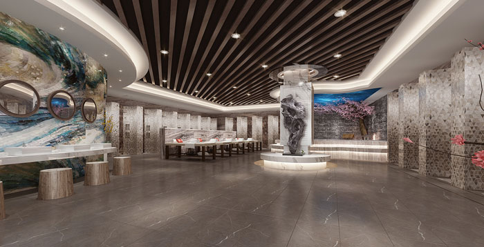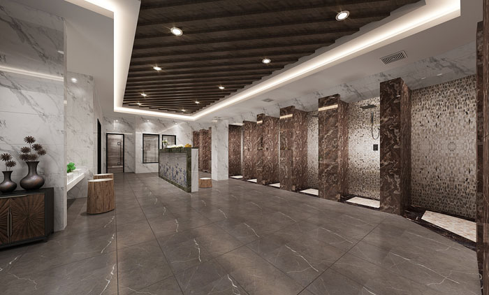 整體是現(xiàn)代風格,深色系背景,貴氣十足,給人舒心的感官.細節(jié)處理到位,比如男/女浴區(qū)設計,關鍵是做好防水,其次是品味,關鍵是高端,衛(wèi)生是第一.客人來洗浴中心,通常是要準備洗澡,消除一天的乏倦,以及消除一些商務活動或工作上所附帶的灰塵.
