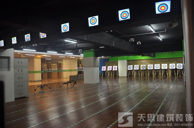 射擊場設備專業裝修大氣又精細,可以滿足人們多種多樣的需求。在射擊場中間安裝著綠色的軟皮材料,柔軟而清新,白色的線條和綠色搭配和諧又美觀。各個射擊展位中間分隔著鐵藝的圍欄,可以保持各個射手之間的安全距離。在射擊場的盡頭擺放著大小一致的靶子,天花板上則安裝著一些藍色和黃色相間的小旗。