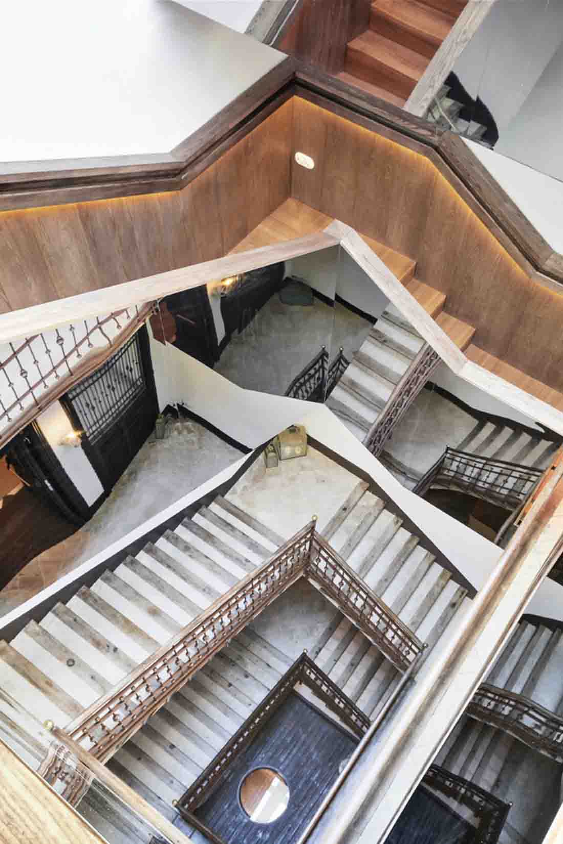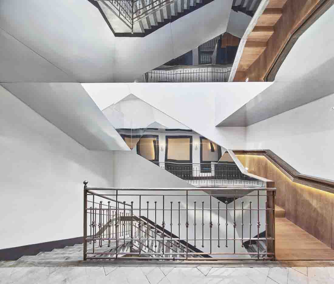 在主樓梯中,天窗被水淹沒,變成了一個(gè)帶有透明底部的小水池,在水中形成了光的活動(dòng),使樓梯上充滿了反射。