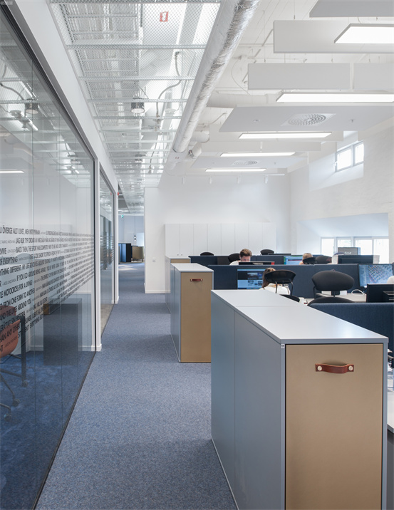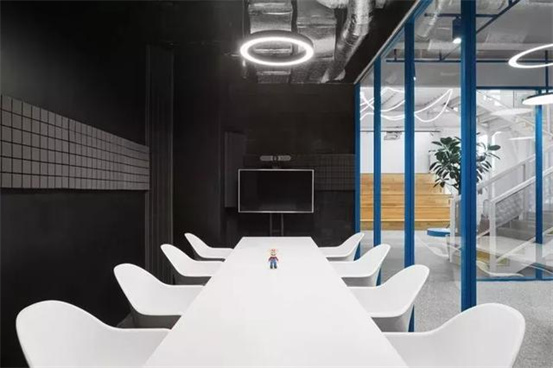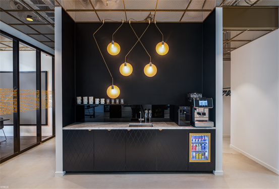 時尚與藝術(shù)并存的辦公室設(shè)計案例:整個空間設(shè)計手法簡約,原有建筑構(gòu)造和設(shè)備管線都展露無遺,色彩的巧妙構(gòu)筑讓這處極簡loft風的辦公環(huán)境充滿了時尚的活力氛圍。墻面上充滿活力的圖案和一張乒乓球桌是視覺中的主角,而主入口就在這里。這里沒有傳統(tǒng)的接待臺,訪客進入辦公室,可以為自己沖杯咖啡,然后進入到內(nèi)部空間。入口處設(shè)有員工更衣室。辦公室的中央是一處大型演講廳,也是主要的活動場所。多功能演講廳配有看臺式階梯座、咖啡吧、屏幕和投影儀、講臺和所有其它必要的設(shè)備,即可以舉辦研討會、各種宣講,也是一處極為舒適的聚會場所。空間內(nèi)的照明設(shè)計非常獨特,采用了網(wǎng)格狀的矩陣布局,將所有燈具串聯(lián)在一起,形成精致的美學效果。整個空間形成一個明亮的背景,襯托出有趣的設(shè)計細節(jié)和墻面圖形設(shè)計。