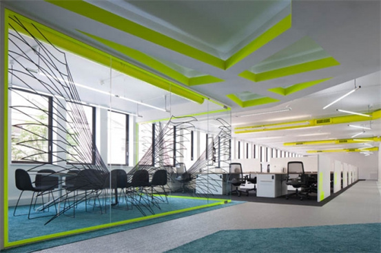 時尚辦公室裝修設(shè)計:以白色為空間主調(diào),加入充滿活力的顏色,如霓虹黃色頂面線槽、以及柔軟的綠松石色地毯點綴在灰與黑色地毯間。裸露的頂面管道噴涂以同樣的黃色;每一組工位都以醒目的霓虹黃色字母加以標識。空間的其它色彩以中性色加以調(diào)和,以免跳躍的霓虹黃色太過強烈刺激。會議室的玻璃隔墻,上面繪制了一系列的天使(Angel)翅膀圖形,為密集的辦公區(qū)增添了豐富的視覺效果。休閑區(qū)與辦公區(qū)之間一道纏繞于金屬管道之間的紅色Z字型隔屏,活躍了空間色彩。設(shè)計師以清新簡約的空間配色,打造了一個開敞明亮、且獨具個性特色的時尚辦公室。