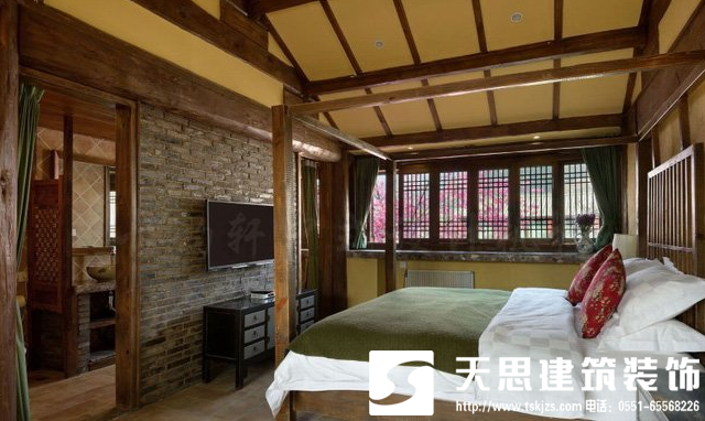 例如上圖中式客棧裝修,天思裝飾設計師以簡約古樸的方法,結合了現代人的審美觀念,讓具特色的建筑藝術和木質雕飾藝術結合在一起,并且把濃郁的民俗民風和傳統中式文化完美融合在一起,以滿足人們生活舒適度為主,增添了不少實用便利功能,讓所有的客棧房間都具備了自己獨特的風格特色,古雅別致,風雅宜人,且充滿自由活力。