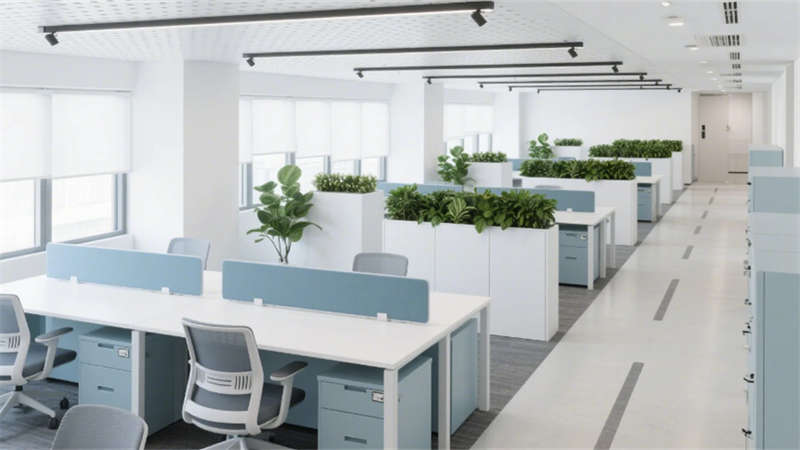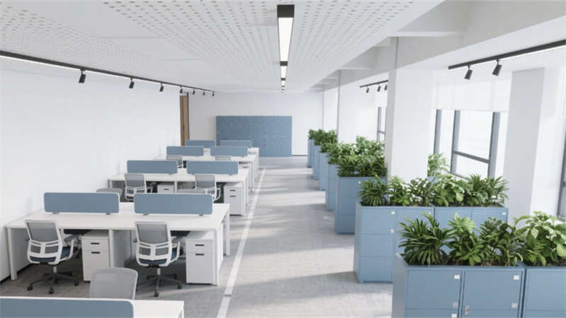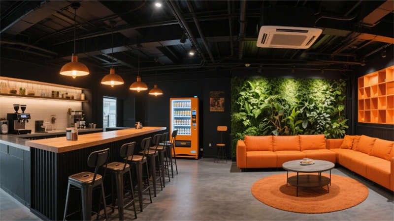 人性化細節貫穿各區域:電梯廳導向系統與隱藏式消防設施實現功能隱形化,員工休息區混搭工業風吧臺與暖光沙發,搭配咖啡機與綠植墻釋放壓力。設計同步植入環保理念,采用低能耗照明系統、空氣監測模塊及可回收建材,構建健康可持續的辦公生態,傳遞企業面向未來的品牌價值觀。