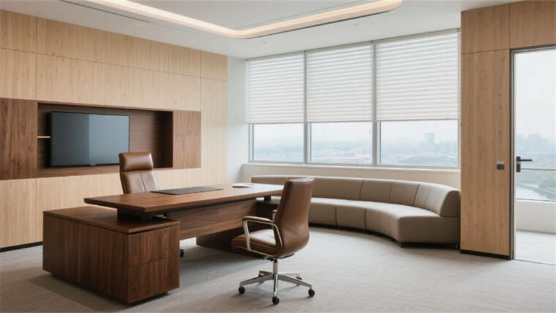 室內空間強調功能與美學的平衡:入口大堂通過12米挑高藝術玻璃墻與企業色燈光系統,構建極具辨識度的第一視覺;開放式辦公區以模塊化工位、綠植隔斷及通透采光優化協作效率;高管辦公室與會議空間則運用木飾面、吸音材質及智能設備,兼顧私密性與科技感。全案貫穿暖灰主色調,局部以藍、橙跳色激活空間活力,啞光金屬、線性燈光與天然材質碰撞,營造理性而不失溫度的氛圍。