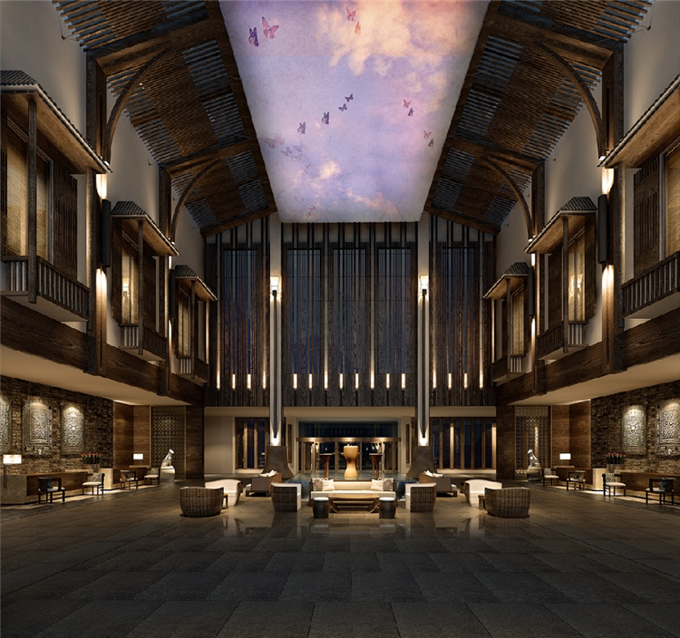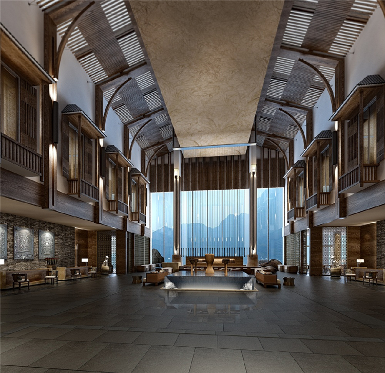 本案度假酒店的室內(nèi)設(shè)計靈感來自于瑤族民居的生活態(tài)度,并結(jié)合對大自然的尊重,運用天然素材以當(dāng)代風(fēng)格重新演繹傳統(tǒng)設(shè)計。山水表現(xiàn)“瑤美”,鼓火表現(xiàn)"瑤情”,圖騰犬則表現(xiàn)“瑤魂”。以盛大的篙火晚會為藍(lán)本。融入舞臺和展示空間的概念。以此增加戲劇化效果。提升賓客對空間的精神感知。