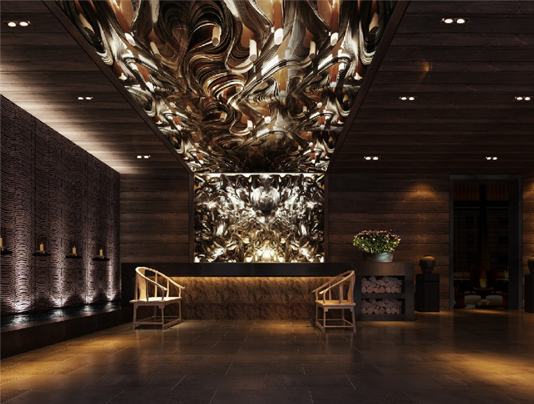 投資方希望打造一個具有民族特色又同時具備國際化背景的星級度假類型的酒店設(shè)計。對傳統(tǒng)文化的有機傳承和再創(chuàng)造是設(shè)計師始終思考的命題。以山、水、鼓、火、圖騰犬五大元素為主線貫穿于室內(nèi)設(shè)計中。