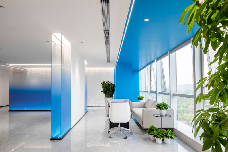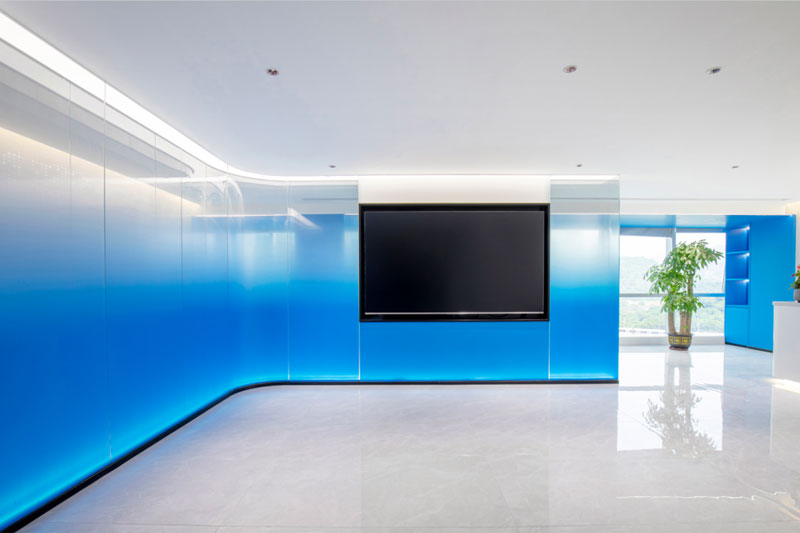 藍色散發出理性、包容與思考,暗含著公司對品質的追求,將公司的“創新、科技、便捷”的理念流露在空間之中。
