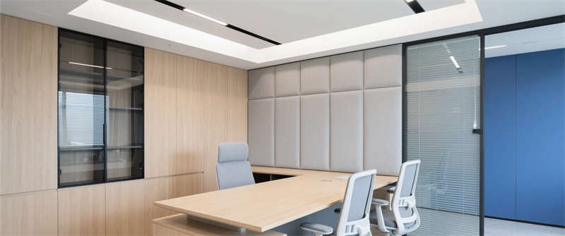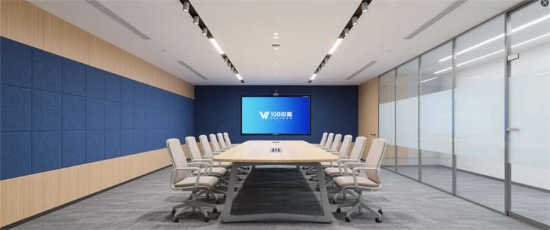 智能會議室:深藍色吸音墻面呼應企業VI色,智能屏幕與玻璃隔斷凸顯科技屬性;