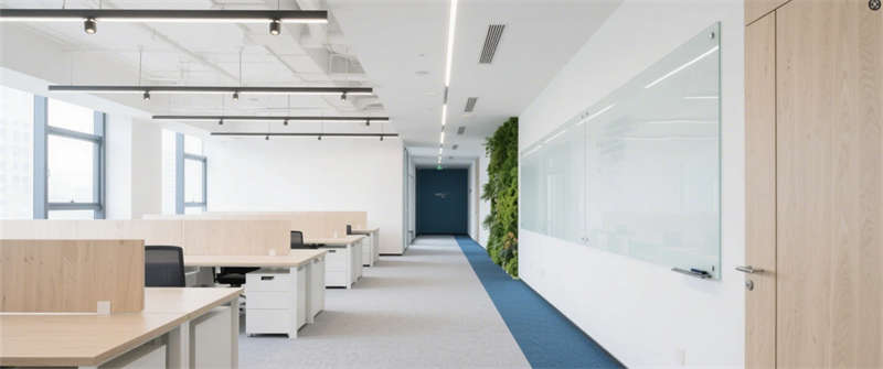開放式辦公區:北歐風工位搭配綠植墻,裸露天花軌道射燈兼顧實用與工業美感;