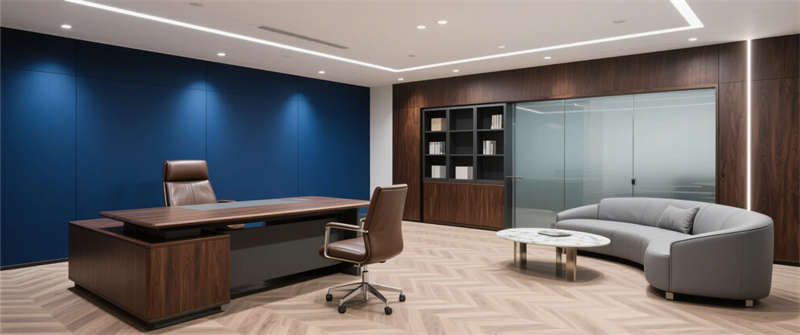 總裁辦公室:人字拼木地板與深胡桃木家具提升質感,深藍藝術漆背景墻強化品牌識別;