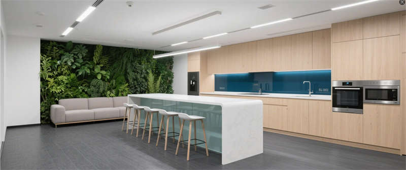 休閑茶水間:白色吧臺與綠植墻營造松弛氛圍,地膠材質耐磨易清潔。