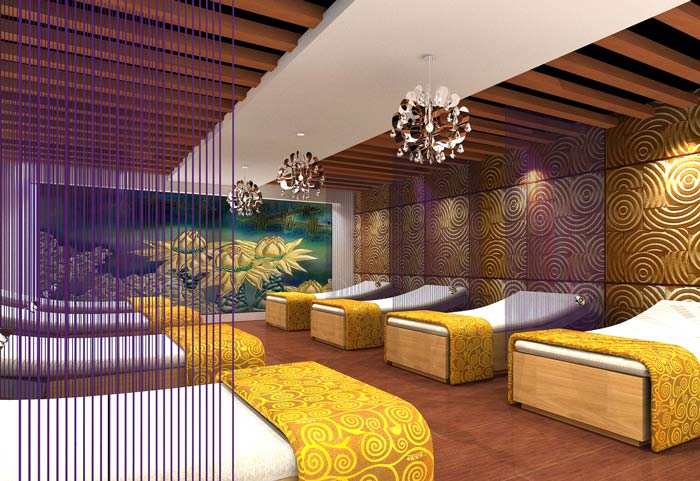 設計師在養生會所裝修設計的時候,根據業主的要求,打造一個心靈舒緩和釋放靈魂的自然氛圍養生會所。運用了意境休閑以及絕對放松的自然氛圍,再加入富有時代氣息現代簡潔的生活要求所輝映的相融合。步移景異,曲徑通幽的格局布置,使空間更為靈動,從而達到使人充分融入放松環境,忘卻塵世的紛擾。自然氛圍養生會所裝修設計的色彩運用上,基本的遵循傳統上的色彩氛圍上,以褐色,金色,紅色為主色調,讓客人在享受服務的同時有更多層次的感受。