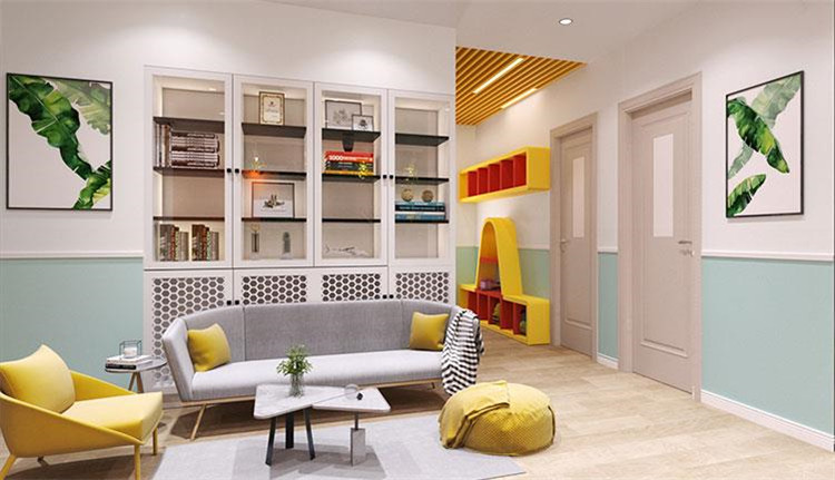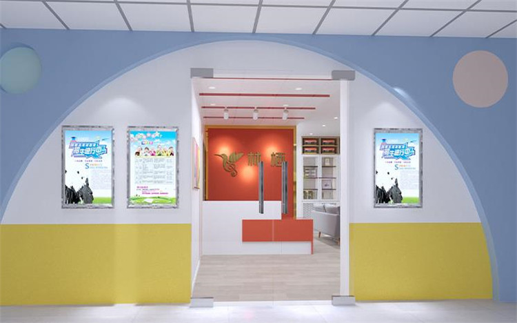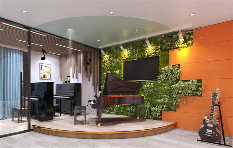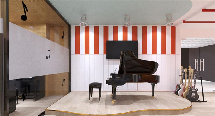 前廳不變的情況下,logo背景墻色調(diào)偏重,所以運(yùn)用了色彩降噪,添加了一些偏冷色調(diào),不僅能夠提升整個空間的舒適感,還能給孩子一個安全、放松的空間。結(jié)合了logo的主色調(diào),再進(jìn)行色彩搭配可以形成歡快、親切、活潑的色彩氛圍。與此同時還設(shè)置了也增加了兩間鋼琴室,提高了空間利用率。大廳玻璃教室內(nèi)墻面貼了吸音板,一方面體現(xiàn)機(jī)構(gòu)在音樂上的專業(yè)性,另一方面就是讓空間的隔音效果做到最佳,讓孩子在學(xué)習(xí)的時候不受干擾,能夠安靜的學(xué)習(xí)。