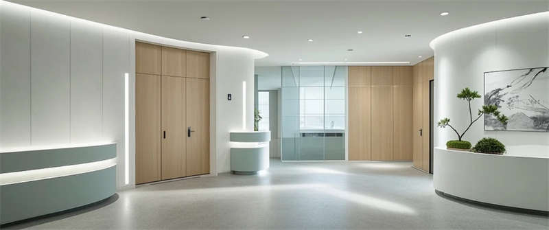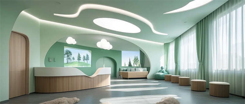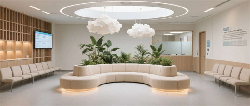 這個醫療空間以自然療愈為語言重塑傳統醫院體驗。建筑內部流動的淺木與灰綠色系,搭配原生綠植景觀墻,模糊了室內外邊界,讓自然光與綠意成為治愈媒介。門診走廊的弧形墻面消解機構冰冷感,兒童診區的森林投影與云朵軟包,用敘事化設計緩解診療焦慮。